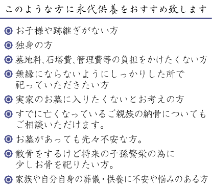 永代供養とは、お子様や跡継ぎの無い方のような、お墓参りできない方に代わって、代わりにお寺が責任持って永代にわたって供養と管理をするお墓のことをいいます。 当山では、お釈迦様ご尊像のお膝元に、故人・ご先祖様のご遺骨を納め、また生きた証を「永代霊籍簿」に入魂し、当山独自の方法にて末永く永代供養申し上げます。