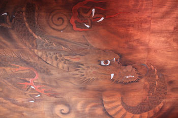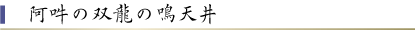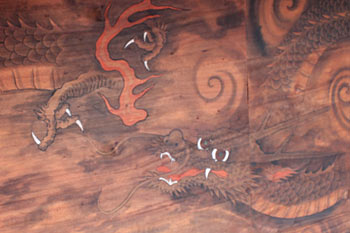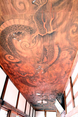 廊下の天井には双龍が描かれております。よく見ていただきますと、口を開いた龍と口を閉じた龍とで阿吽の龍となっております。阿は人が生まれる時の音であり、吽は人が亡くなる時の音であります。すなわち人間の一生涯である生と死を意味いたします。
