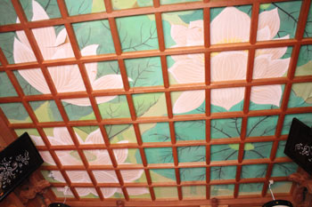 天井の蓮華の絵は、お釈迦様がお説きになられた清らかな蓮華蔵世界をあらわし、格子は苦×苦(九×九)の世界より解脱し、宮中における吉数である八十一を表した格子になっております。