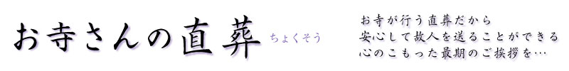 直葬とは、ご逝去されたら自宅または病院から直接火葬場に運び、火葬にする、通夜・告別式などの儀式は行わない形式のことをいいます。 龍源院の「お寺さんの直葬」では、直葬というシンプルな形はとりながらも、お寺だからできる心をこめた最期のご挨拶を行うことができます。