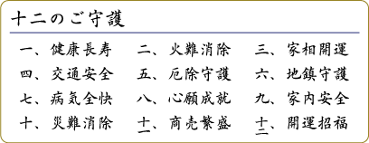多くのご霊験あるお薬師様は脇侍に日光・月光菩薩を従え、更に十二神将が昼夜を守護しています。この十二神将は薬師の本願である十二誓願をそれぞれに司り、昼夜十二時と十二カ月と生まれ年である十二支の守り本尊として、降りかかる災難より守護し、特に十二の大願を成就するといわれております。